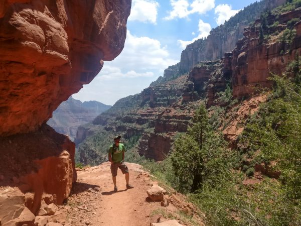 Wir machen eine kurze Wanderung ein paar Hundert Höhenmeter in den Canyon hinunter. Eine beige, bewachsene Schicht wird von einer fast weißen, steil abfallenden Wand abgelöst, bis wir die sehr schöne Schicht mit rotem Sandstein, Siltstein und Kalkstein erreichen. Schade, dass wir das Auto nicht länger mieten und wir somit nicht bis zum Colorado River gehen können. Dafür müssten wir vom North Rim zwei Tage einplanen.