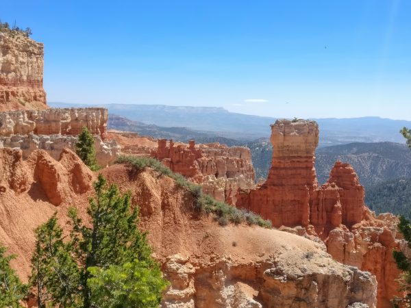 Rote, pinke und beige Steinsäulen und -rippen ordnen sich in einem großen Bogen als Amphitheater an, auf das wir von der Klippe runter staunen. Es sieht aus wie ein fragiles Kunstwerk aus Statuen und Sandburgen. In diesem Moment können wir noch gar nicht glauben, dass unser erster offizieller Canyon im Vergleich zu den „großen“ ziemlich klein ist, und dass unsere Begeisterung noch übertroffen werden wird.