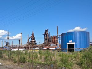Die Landschaft ist mittlerweile etwas hügeliger geworden. Wir freuen uns über die kleinen Steigungen und die darauf folgenden Möglichkeiten das Rad mal rollen zu lassen. Felder sieht man immer noch überall. Jedoch sind es hier hauptsächlich Mais- oder Erdnussfelder mit dazwischen „gestreuten“ Farmen und Wäldchen. Je weiter östlich wir kommen, desto mehr Industrie ist zu sehen. Wir erreichen den Rust Belt, welcher zu Beginn des 20. Jahrhunderts seine goldene Zeit hatte und jetzt eher vor sich hin rostet. Unsere Augen freuen sich nach der endlosen Eintönigkeit der Great Plains über diese Abwechslungen. Obwohl die Temperaturen im angenehmen 20er Bereich liegen, sind wir ständig total nass. Die Luftfeuchtigkeit ist so hoch, dass unsere Merino- oder Baumwoll-Shirts nicht mehr trocknen. Sehr bald schaffen wir uns ein Shirt aus Viskosefasern an und fahren weiter… nicht mehr ganz so nass.