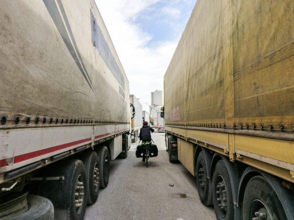 Die ersten paar Kilometer im Iran sind… nun ja… Lastwagen-Stau an der Grenze.