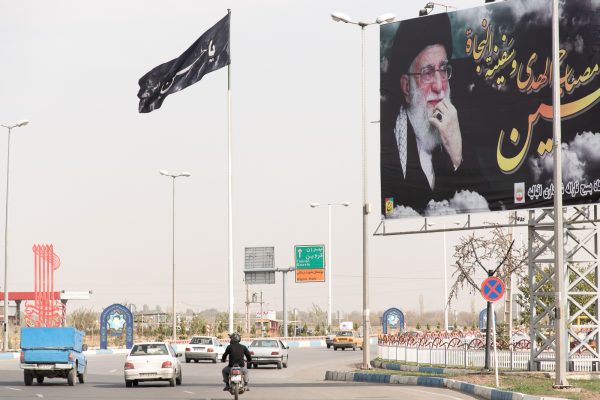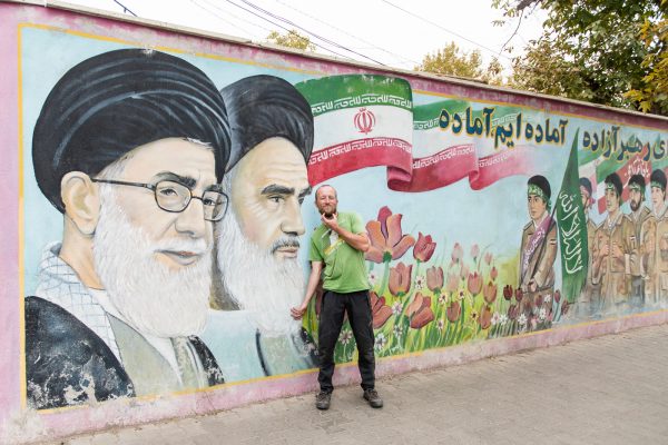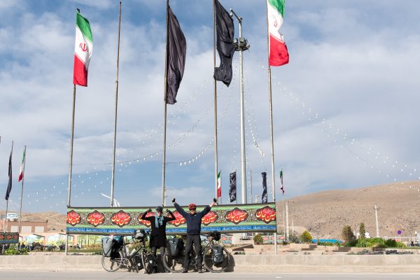 Unter den ersten Flaggen des Landes schießen wir das obligatorische Ankunftsfoto. Während unserer Zeit im Iran sind nicht nur die Landesflaggen allgegenwärtig, sondern auch schwarze Flaggen. Sie sind Symbol der alljährlichen Trauer um Imam Hussein – Märtyrer und Enkel des Propheten Mohammed. Pech für uns: Während der 40 Trauertage ist im ganzen Land sämtliches Vergnügen streng verboten.