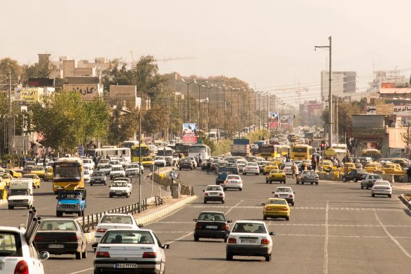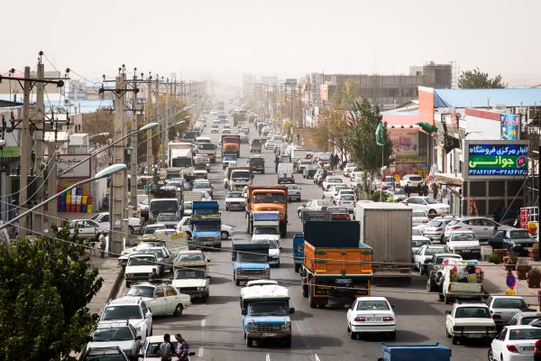 Einfahrt nach Täbris – Hauptstadt der Region Ost-Aserbaidschan: Stress pur. Während der Fahrt bleibt weder Zeit fürs Navi, noch für Kommunikation. Kurze Iran-Auto-Farbenlehre: Weiß = Privater PKW, Gelb = Taxi, Bunt = LKW