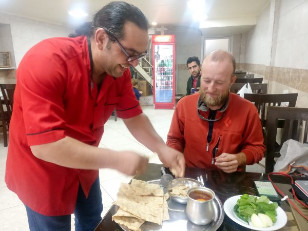 Auch dieser Herr ist – selbst wenn es nicht so aussieht – im Schuhgeschäft. Weil die Zeiten aber hart sind, betreibt Yusef mit einem Freund neben der gemeinsamen Schuhfabrik noch ein kleines Restaurant. Hier erklärt er Hannes herzlich, wie man Dizi – ein traditionelles Iranisches Gericht – richtig isst.