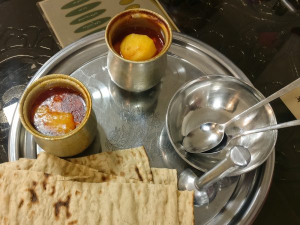 Das ist Dizi. Als ahnungslose Europäer wissen wir anfangs nicht recht, was man mit Stössel, Schale und Löffel anfangen soll. Es ist einfach: Heißen Inhalt des Bechers in die Schale leeren. Brot falten, in kleine Stücke zerreißen, und dazu geben. Mit dem Stössel alles zerstampfen. Mit dem Löffel essen. Sehr lecker!