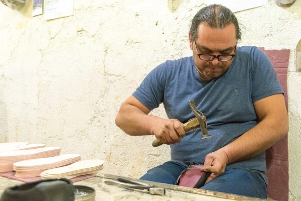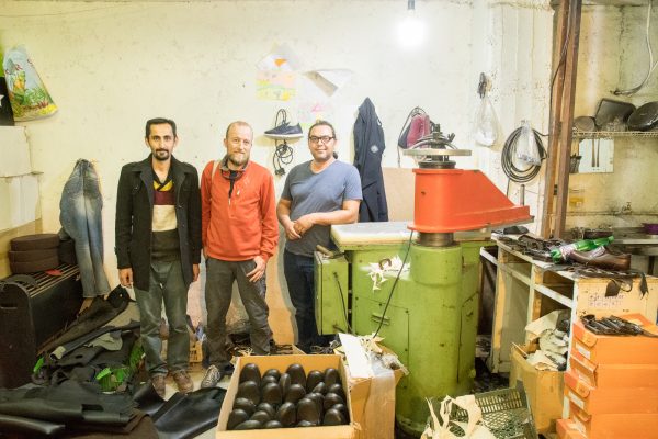 Mit alten Maschinen wird dort Leder gestanzt, genagelt, genäht und geklebt. Yusef hat das Schuhmacher-Handwerk in der Türkei gelernt und designt vom Sportschuh bis zum Stiefel alles selbst. Tagsüber arbeiten hier 5 Angestellte.