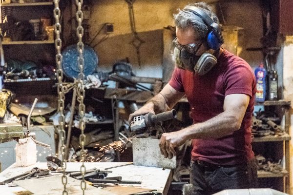 Es dauert nur ein paar Minuten bis der Meister der Metallbearbeitungskunst ein passendes Blech zugeschnitten hat – kein Handgriff ohne Mund-, Augen- und Gehörschutz.