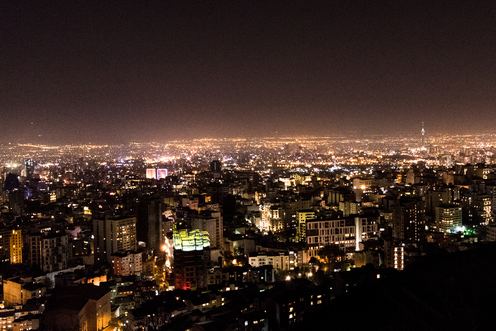 Von den Hügeln vor Teheran lässt sich die Dimension der 9-Millionen-Metropole vage erahnen. Das „Türmchen“ rechts im Bild ist der 440 m hohe Milad Tower (der auf einem ca. 200 m hohen Hügel steht, was ihn ca. 600 m hoch über die Dächer empor ragen lässt). Im Foto liegen ca. 80% von Teheran hinter dem Turm.
