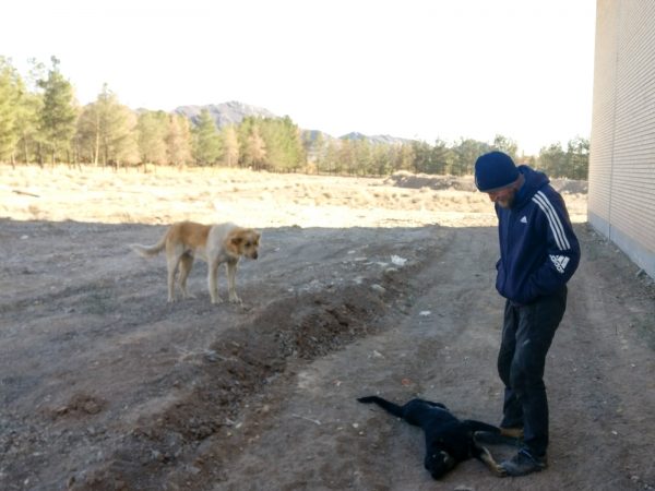 In der Nacht entdecken drei Hunde aus der Nachbarschaft unser Zelt, als wir schon im Nest liegen. Das Rudel belagert uns stundenlang mit einschüchterndem Knurren und Kläffen. Wir sehen die Hunde nicht und bleiben sicherheitshalber im Zelt – zu blöd wäre jetzt ein Hundebiss. Am nächsten Morgen entpuppen sich die drei als ein Feigling, ein Verspielter und ein Behinderter. Mit denen wären wir wohl auch im Schlaf fertig geworden… 😉