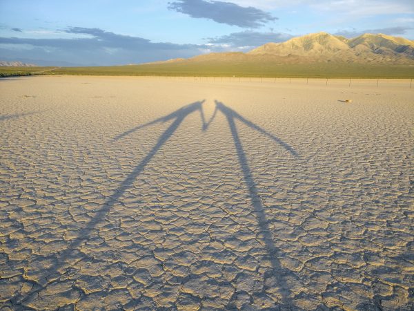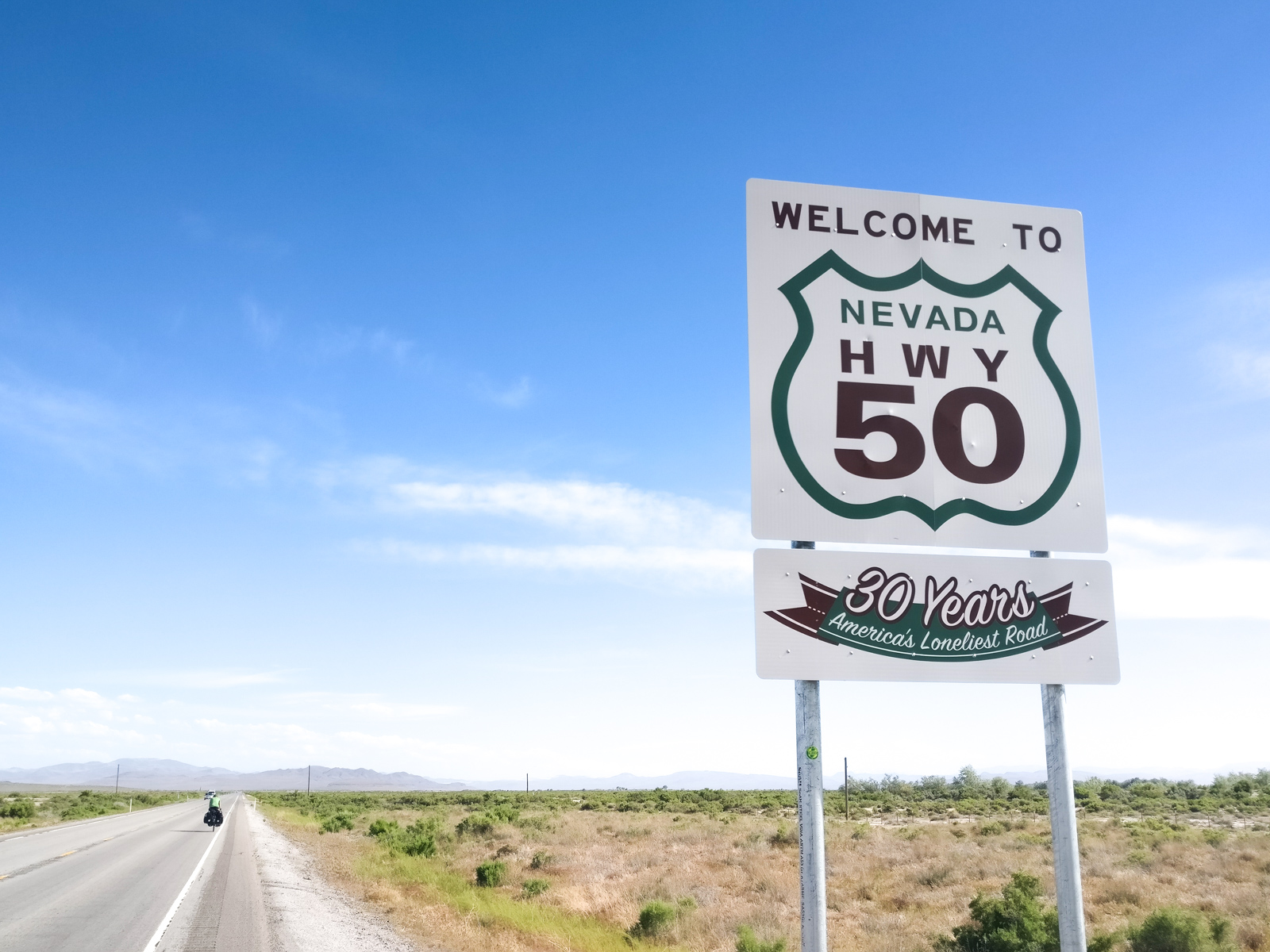 Auf dem Highway 50, der einsamsten Straße der Staaten, kommen wir maximal einmal am Tag in eine Siedlung oder ein Städtchen. Wir nutzen diese Gelegenheiten um unsere Vorräte und vor allem das „Dromedar“ wieder aufzufüllen, obwohl es weniger heiß als erwartet ist – zu Beginn komfortable 20 bis 25 Grad tagsüber. Die Leute in den Siedlungen fangen an, uns vor dem bevorstehenden kalten Wetter zu warnen. Die Tage werden schnell kühler und die Nächte werden kalt. Wir bereiten uns auf härtere Nächte im Zelt vor, indem wir alles Mögliche zum Schlafen im warmen Schlafsack anziehen. Es hilft auch sehr, dass wir zu zweit sind und uns gern haben.
