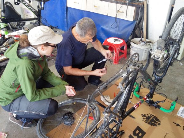 Die Anfrage nach Ersatzteil-Beschaffungsmöglichkeiten wird bei Rohloff mit „Selbst schuld, wenn du keine Ersatzteile mitnimmst.“ beantwortet. (Danke Barbara Rohloff – nach Ihren end- und sinnlosen Monologen über Pflicht-Zertifizierung von Rahmen, nach der Pflicht-Nabenflansch-Verstärkung ab der zweiten Einspeichung trotz Pflicht-Verwendung zertifizierter Speichen haben wir von der überheblichen Kunden-Entmündigung durch Ihr Unternehmen die Schnauze nun endgültig voll. Unser nächstes Rad bauen wir sicher rund um eine Pinion!) Also tüfteln wir gemeinsam mit einem lokalen Fahrradmechaniker eine improvisierte Lösung aus. (Die richtige Antwort auf unsere Anfrage an Rohloff wäre übrigens gewesen: Entferne die Mantel-Litzen eines gewöhnlichen Shimano SIS-Schaltzugs und verwende den Seilkern als provisorisches Ersatzteil – kost‘ nix und funktioniert seit 4000 km tip-top!)