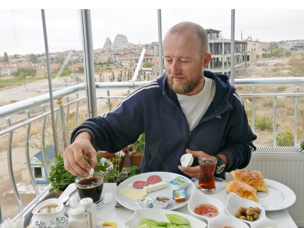 Unter diesen Umständen spart man sich gerne die Zeit fürs Auf- und Abbauen des Zeltes und fürs Kochen und Abwaschen. Wir erreichen Kappadokien, wo sich im Hintergrund am Horizont schon einige der bekannten Felsformationen dieser Gegend abzeichnen.