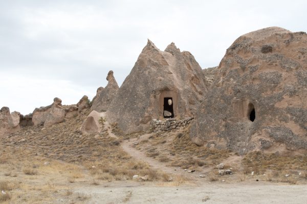 Der weiche Tuffstein, aus dem die natürlichen Steinhütchen durch Erosion entstanden sind, ist relativ leicht zu bearbeiten. Also haben sich die „Häuselbauer“ in Kappadokien über viele Jahrtausende hinweg bei Bedarf einfach ein solches Steinhütchen geschnappt und innen ausgehöhlt – und fertig war das Häuschen!