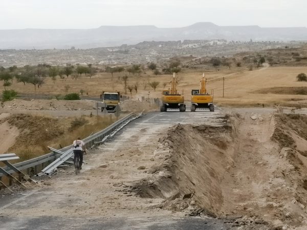 Der vulkanisch-weiche Tuffstein hat der Erosion durch Wasser wenig entgegen zu setzen. Da passiert es schon mal, dass ein Teil einer Straße abrutscht. Für uns sind beschädigte Straßen das Beste, weil wir die Problemstellen mit den Rädern meist passieren können, und dahinter eine autofreie Fahrbahn wartet.