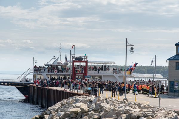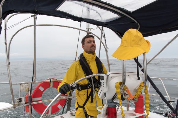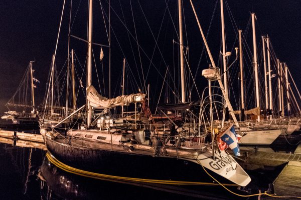 Kurz vor unserer Ankunft in der Walhauptstadt hatten wir einen perfekten Plan für die letzten Tage in Kanada gemacht: Gemütliches Whale-Watching und dann noch genügend Zeit um durch New Brunswick zu radeln und unseren Flug Mitte September in Nova Scotia zu erreichen. Zwei Tage nach dem Schmieden dieses Plans meldet sich jedoch unser Freund Gaël und fragt, ob wir noch ein paar Tage bei einer Bootsüberstellung mithelfen wollen. Dieses Angebot lassen wir uns nicht entgehen, und es folgen lange Überlegungen wie wir unseren „perfekten Plan“ nun entsprechend anpassen können – mit zwei vollgepackten Fahrrädern ist die Logistik nicht immer einfach. Da aus unserer ursprünglich geplanten Atlantiküberquerung leider nichts geworden ist, freuen wir uns riesig, nun wenigstens ein paar Tage auf einem Segelboot verbringen zu können – noch dazu mit Gaël auf seinem Boot der GravlaX. Wir verkürzen also das Whale-Watching in Tadoussac, nehmen die nächste Fähre wieder zurück ans Südufer, strampeln einen Tag lang „Vollgas“ nach Rimouski und steigen dort ohne unsere Fahrräder in einen Bus, welcher uns nach Gaspé – unserem Treffpunkt mit Gaël – bringt. Die nächsten 60 Stunden werden sehr abwechslungsreich, zuerst entspannt und mit wenig Wind, danach mit Regen und etwas zu viel Wind. Auch wenn dieser Törn alles andere als Badewannen-Segeln ist, freuen wir uns über die Zeit mit der Crew auf dem Boot. Am St. Lorenz Strom herrscht zur Herbstzeit „Stoßverkehr“ unter Walen, Seehunden und anderen Meeresbewohnern und die Bootsfahrt wird zu einer wahrhaften Meeres-Safari.