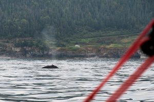 Je weiter wir nach Osten fahren und umso näher wir dem Atlantik kommen, desto reicher wird das Fischangebot – im Supermarkt wie auch im Wasser des St. Lorenz Stroms. Neben den kleinen Tierchen, werden aber auch die großen immer vielfältiger und häufiger. Mit Tadoussac erreichen wir das Schlaraffenland der Wale, wo spezielle Strömungsverhältnisse planktonreiches Meerwasser an die küstennahe Wasseroberfläche bringen. Wir sind an einem der weltweit besten Schauplätze um die Riesensäuger vom Ufer aus zu sehen. Tatsächlich dauert es nur ein paar Minuten und wir erblicken die ersten winzig-weißen Punkte im Wasser, welche Kathi sofort als Belugawale entlarvt. Etwas später bei einem besonders guten Uferplatz, sitzen wir auf einem Stein und warten gemeinsam mit einer kleinen Menge anderer Whale-Watcher. Nach ein paar Minuten kommt der erste „Bbbbssscch“-Blas und wir sehen einen schwarzen runden Rücken mit einer kleinen Finne – ein Zwergwal sagt Hallo. Er (oder sie) kommt noch zweimal hoch um Luft zu holen und macht dann beim dritten Mal einen runderen Rücken, um für die nächsten 10-15 Minuten zu verschwinden. Es folgen weitere Buckel- und Zwergwale. Wir freuen uns und genießen die Ruhe, die dieses Erlebnis mit sich bringt.